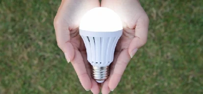 Energy efficient light bulb in open palms.